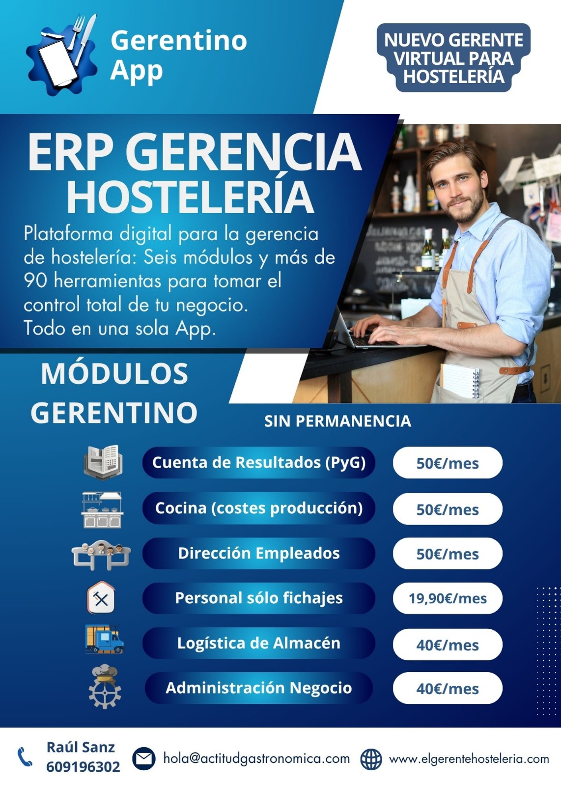 A través de Gerentino, nuestra app-gerente virtual, tienes acceso a más de 80 herramientas para controlar áreas clave como administración, stock, personal, cocina y cuenta de resultados.